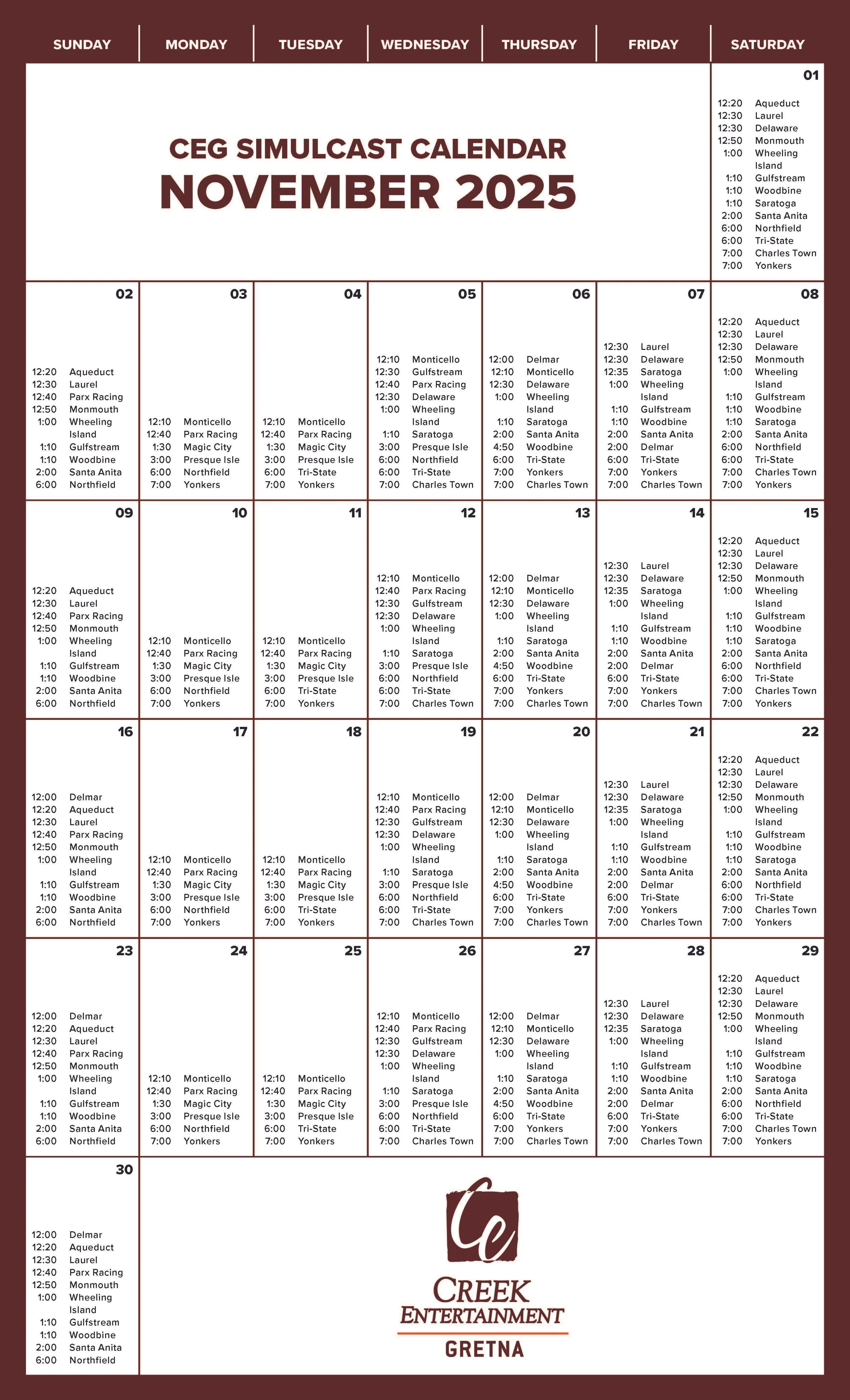 Bet here like you're there! Simulcast is the simultaneous broadcasting of multiple races at different venues, shown on screens here at the Creek Entertainment Gretna. Racing fans interested to know what is happening around the area's racing tracks can watch live from venues across the country. See our calendar for exact times and dates.
